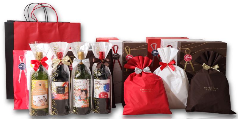 お手軽なボトルラップ、ギフトボックスから豪華な木箱までご用意。メッセージカード、手提げ紙袋もございます。熟練スタッフが心を込めてラッピングさせていただきます。